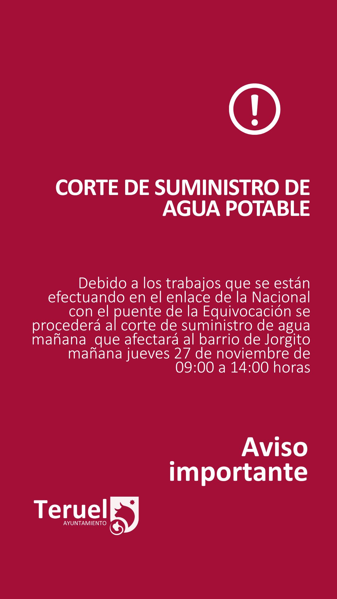Debido a los trabajos que se están efectuando en el enlace de la Nacional con el puente de la Equivocación se procederá al corte de suministro de agua que afectará al barrio de Jorgito mañana jueves 27 de noviembre de 09:00 a 14:00 horas.